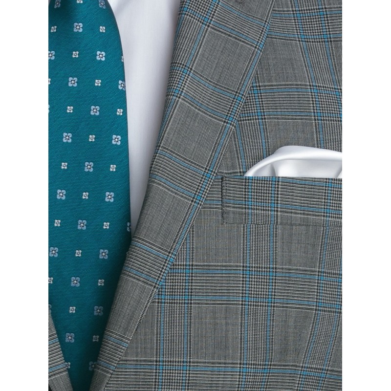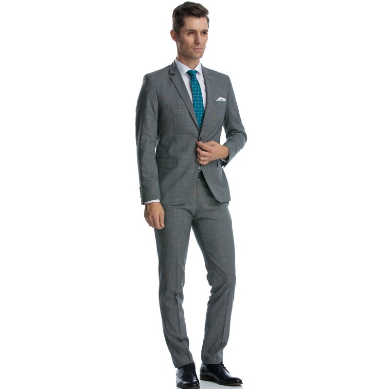 Costum in carouri din lana, gri cu turcoaz, format din 2 piese, sacou la 2 nasturi si pantaloni. Este o alegere perfecta pentru o tinuta business, impreuna cu o camasa alba si o cravata in picouri. Stofa este 100% naturala, asadar te vei bucura de confortul unei tesaturi fine si elastice, fiind in acelasi timp si rezistenta la sifonare.