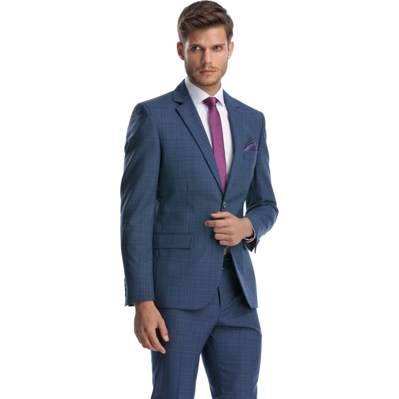 Costum din lana cu sacou la 2 nasturi si butoniera la rever. Modelul tesaturii este in caro, intr-o combinatie discreta de bleumarin si roz. Stofa este 100% naturala, provenita de la cunoscutul producatorul italian Zignone, ceea ce ii ofera costumului nu doar confort la purtare, ci si rezistenta la sifonare si uzura.