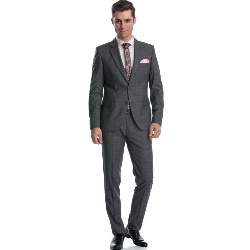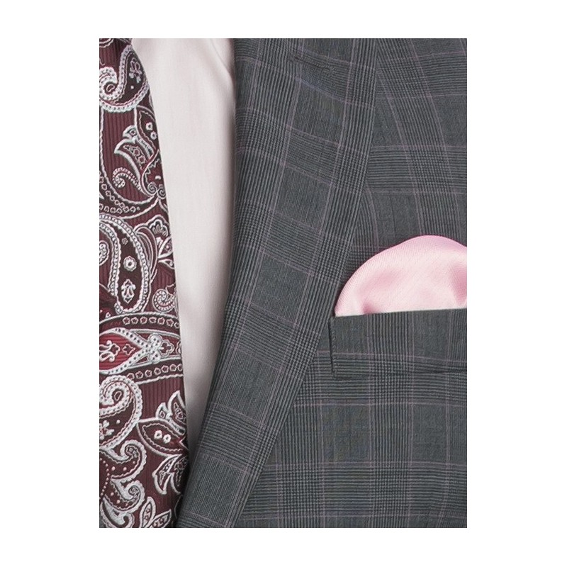 Costum din lana in carouri gri cu roz, o alegere perfecta pentru barbatii indrazneti. Iti recomandam sa il asortezi cu nuante de roz si visiniu pentru un plus de eleganta.