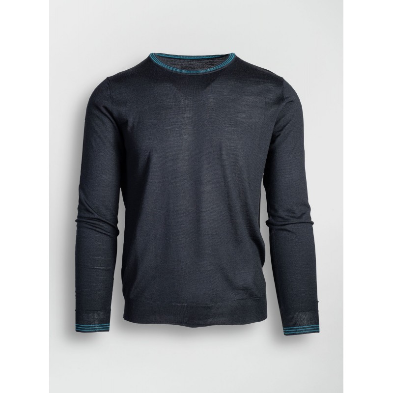 Pulover uni negru, cu insertii discrete turcoaz la gat, realizat dintr-o tesatura fina de amestec de lana cu acril.
