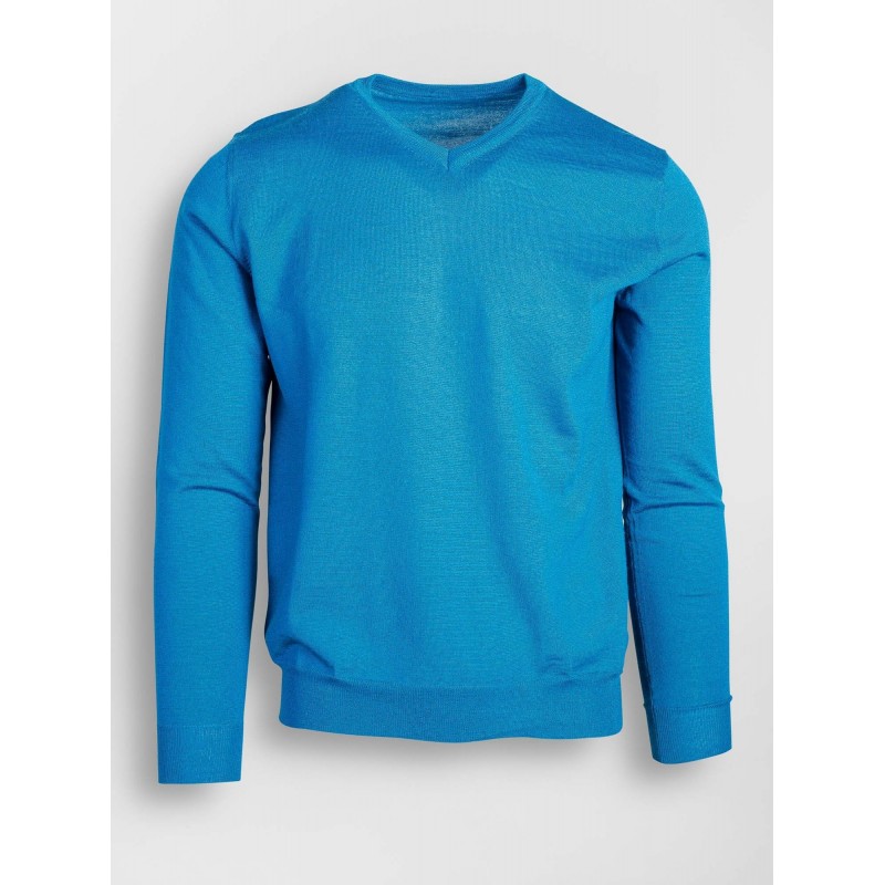 Pulover albastru, realizat dintr-o tesatura fina de lana 100%.